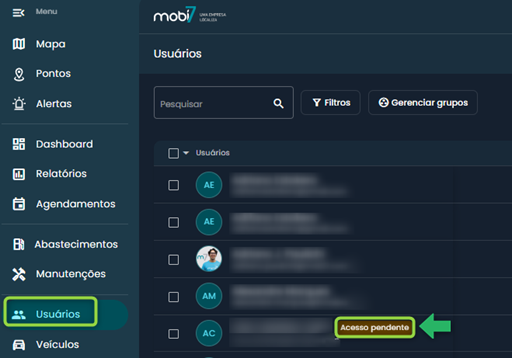 Caso um determinado usuário ainda não tenha acessado a plataforma, aparecerá o aviso de Acesso pendente na respectiva linha do usuário que não realizou o acesso.