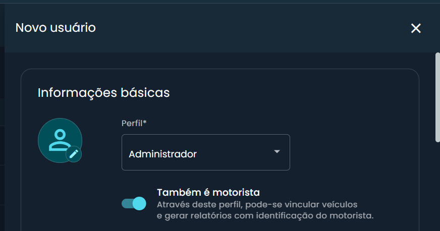 A caixa de seleção “Também é motorista” permite que todos os perfis de acesso também sejam identificados como motoristas, para que suas documentações e códigos do Identificador do Condutor também sejam inseridos no sistema.