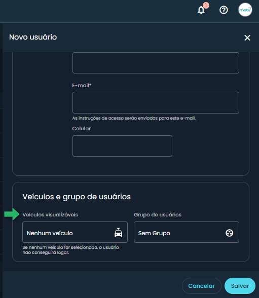 Depois de definir o perfil de acesso do novo usuário, é necessário selecionar quais veículos serão visualizáveis para o usuário cadastrado. Por meio da seção Veículos e grupo de usuários, você pode liberar acesso à toda sua frota para visualização ou apenas um grupo ou veículos específicos.