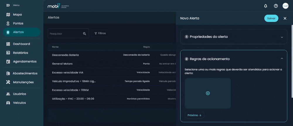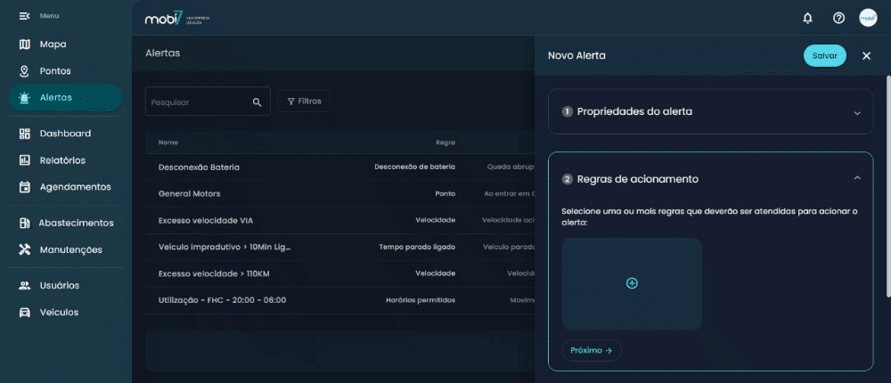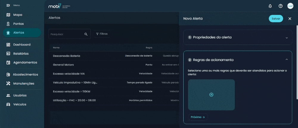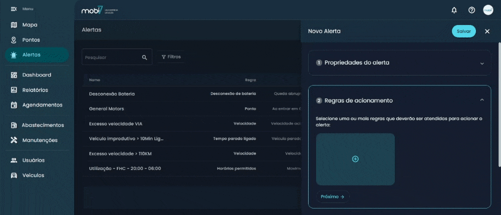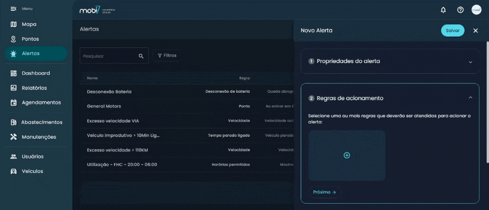 - Veículos: selecione para quais veículos o novo alerta será aplicado;