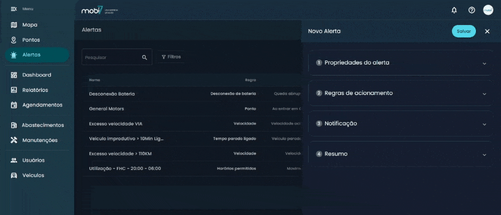 Os Alertas são uma funcionalidade da plataforma Mobi7 que podem auxiliar no cumprimento das normas de uso estabelecidas na Política de Frota da sua empresa.