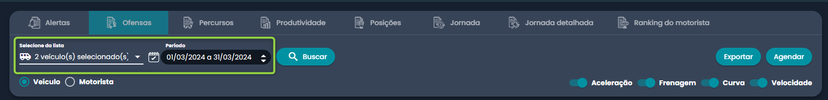 2. Selecione os veículos que deseja visualizar e o período:
