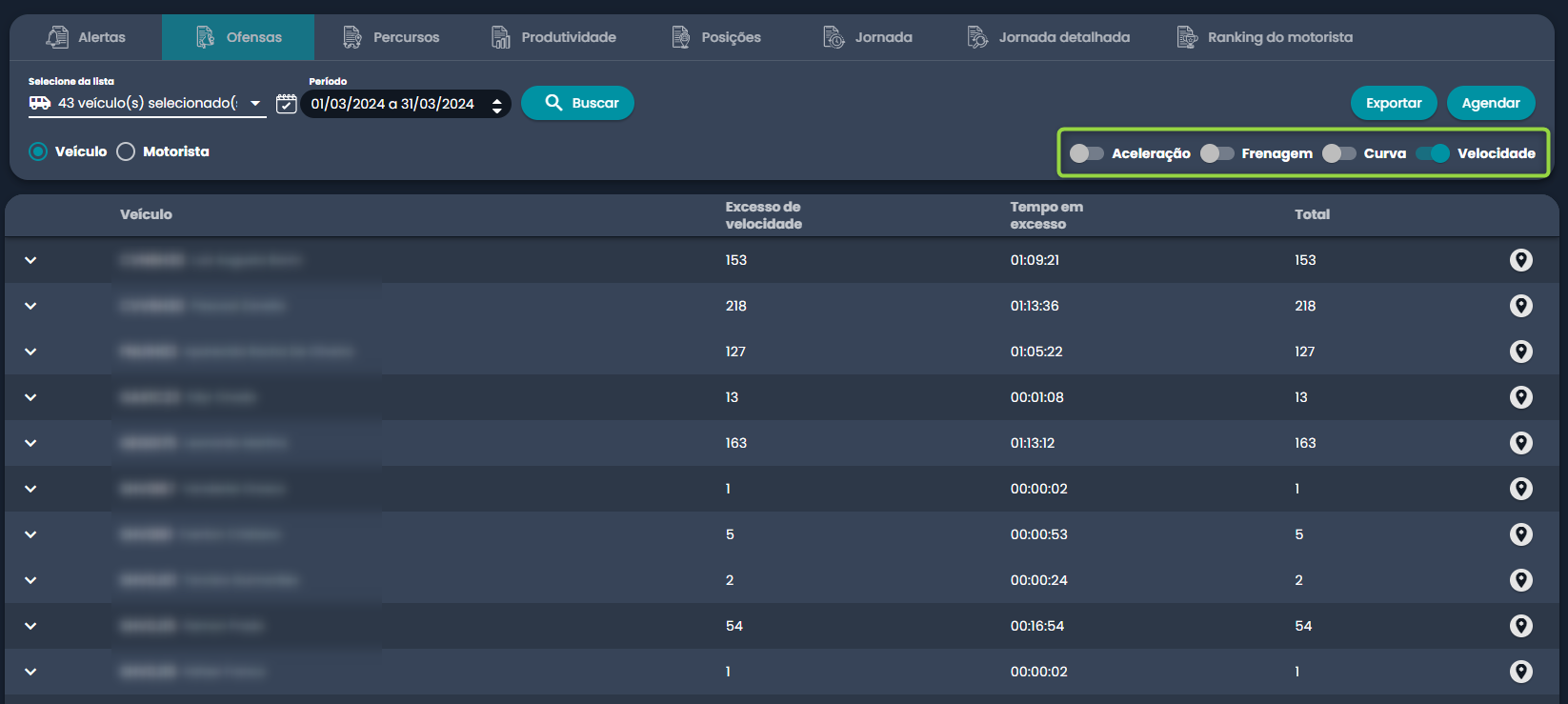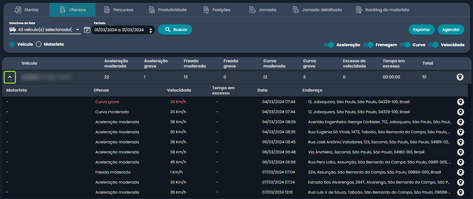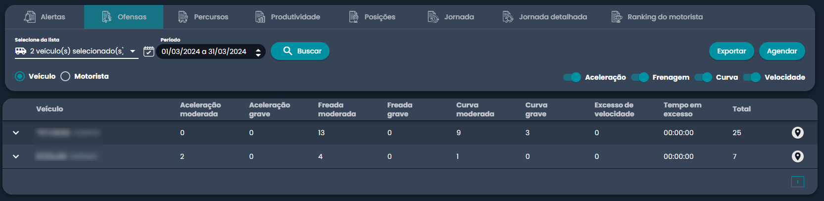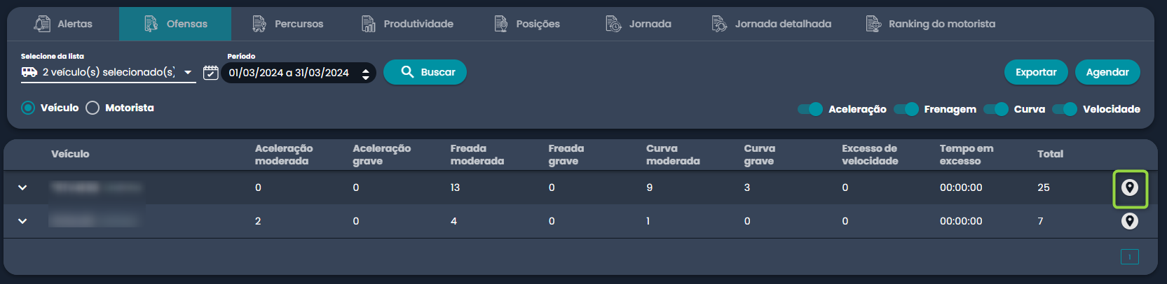 O relatório vai trazer as informações consolidadas das ofensas de cada placa da frota. Para visualizar na tela o detalhamento, é possível clicar na seta indicada na captura de tela abaixo: