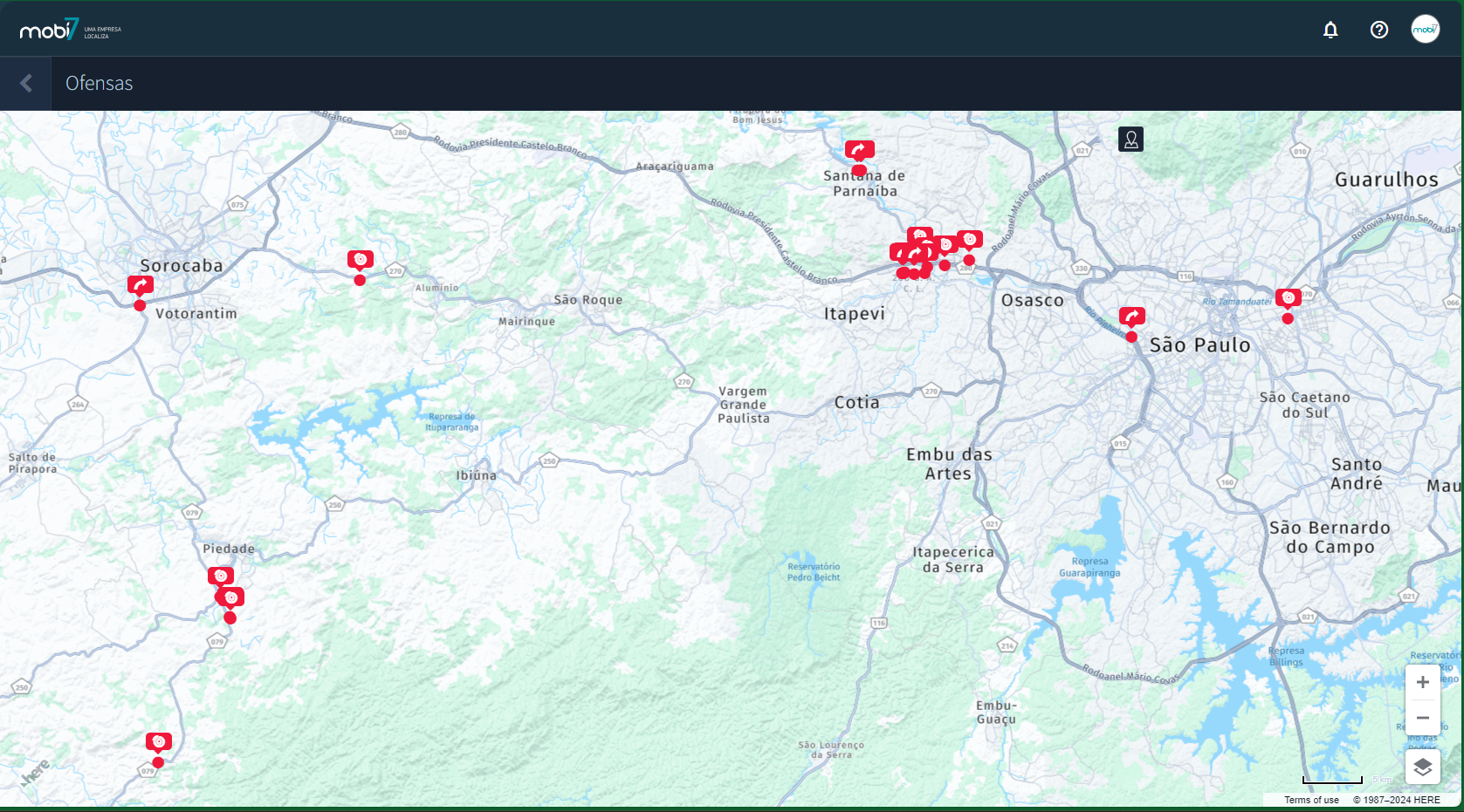 na linha com o total de ofensas, todas as ocorrências geradas no período pesquisado serão exibidas, apresentadas em um mapa com os locais onde cada uma delas foi gerada.