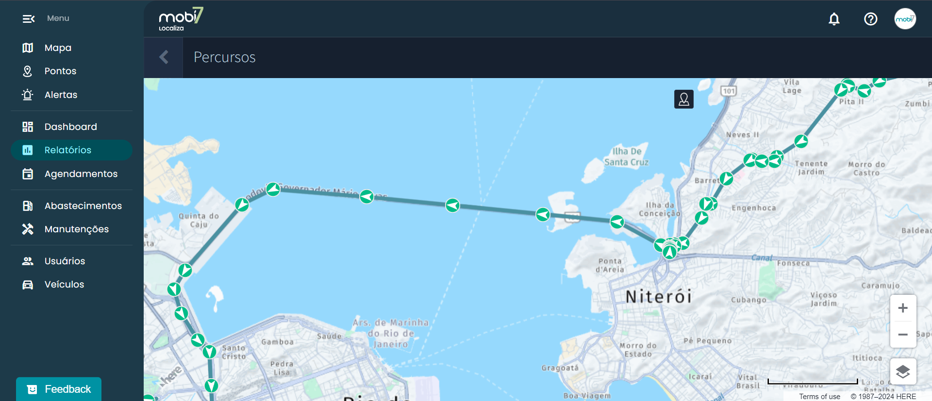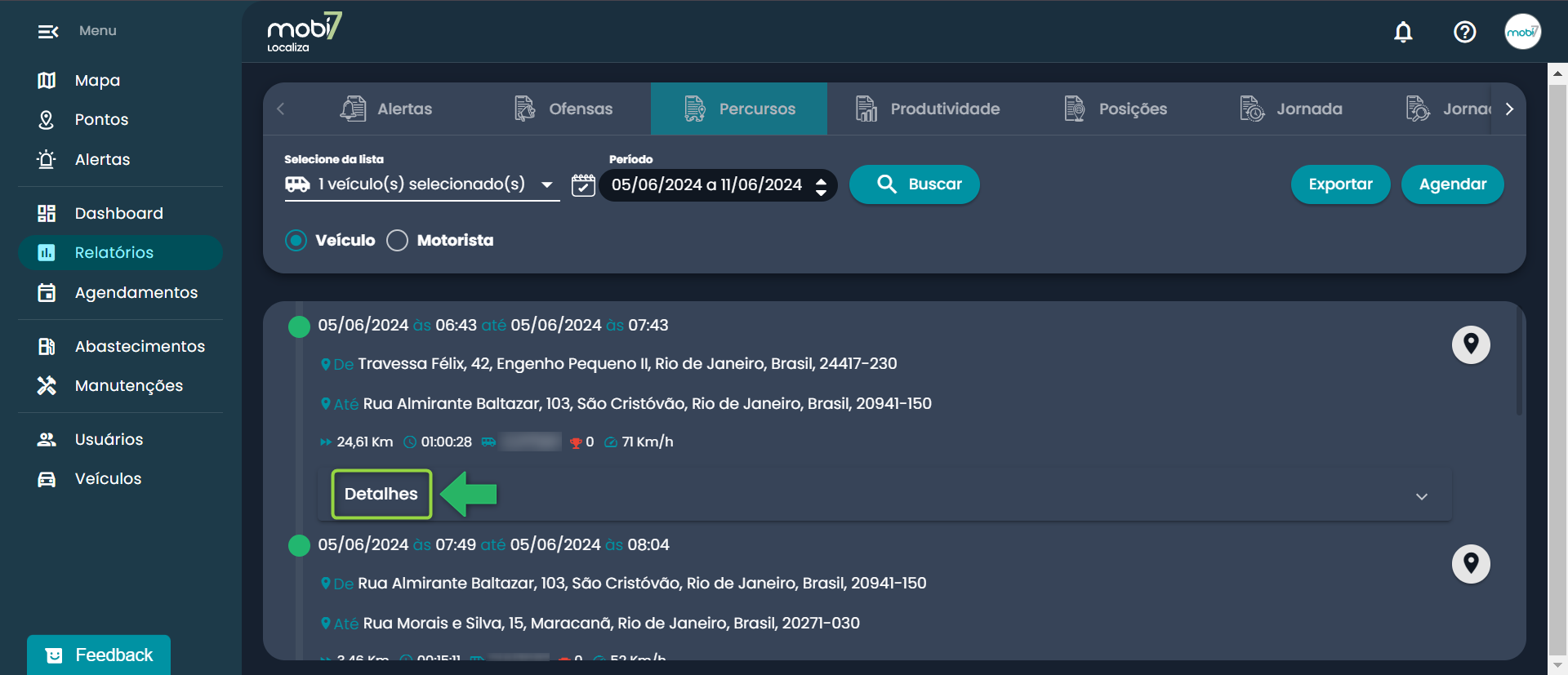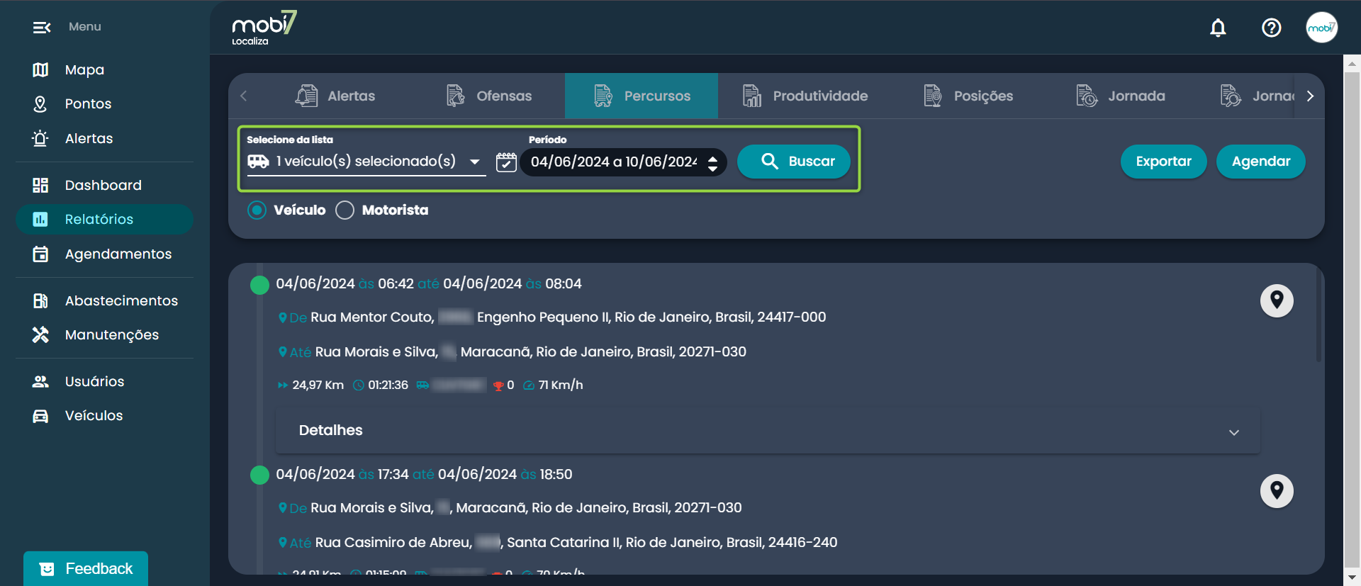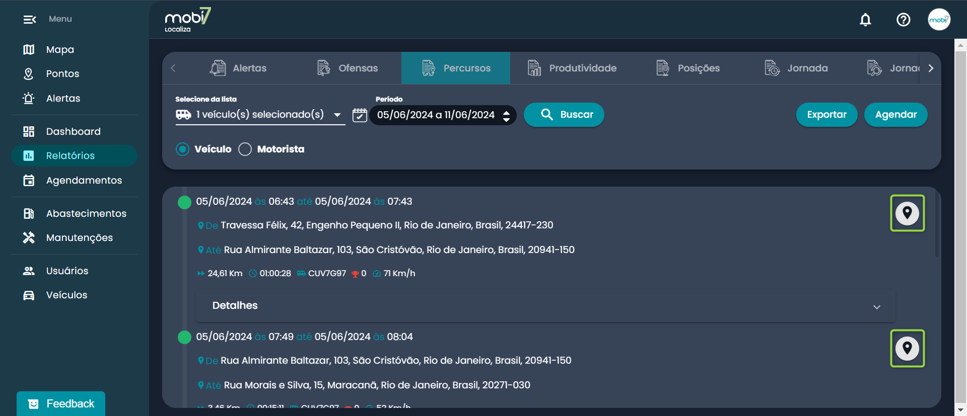 O relatório exibirá todos os trajetos realizados separados em cards.