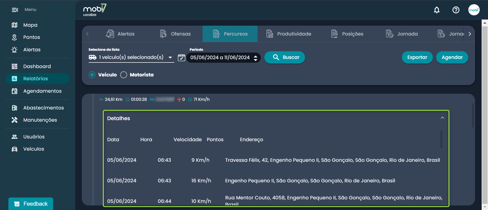 O Relatório de Percursos exibe as informações dos trajetos realizados pelo veículo pesquisado no período selecionado.